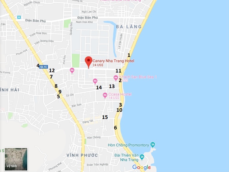 Canary Nha Trang Hotel is located at the middle of Mai Xuan Thuong Street. Our neighborhood boasts variety of local cuisines such as: buffet Zallo Beach Nha Trang, Bien Hong Restaurant, Huong Bien Restaurant etc.